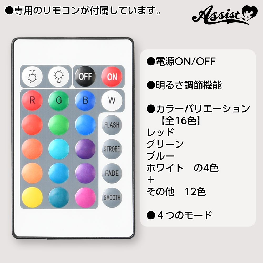 リモコンボタンの操作でカラー、明るさ、モードさまざまなバリエーションを楽しめます。