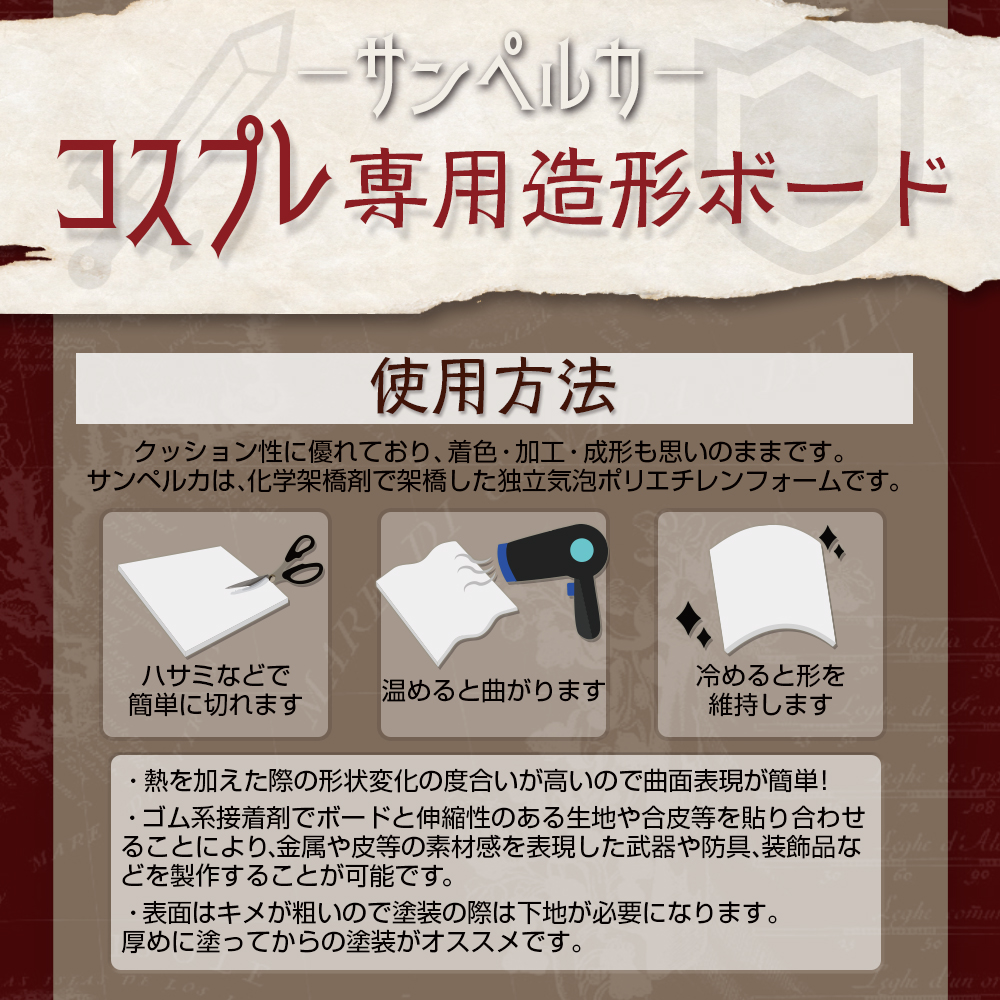 ・ゴム系接着剤でボードと伸縮性のある生地や合皮等を貼り合わせることにより、金属や皮等の素材感を表現した武器や防具、装飾品などを製作することが可能です。