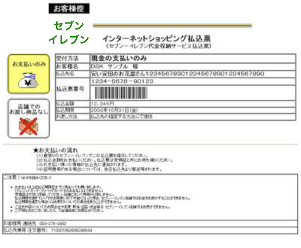 ①利用コンビニの選択画面にて「セブンイレブン」を選択し、画面の案内に従い申し込み手続きをしてください。 ②お申し込み完了後に表示される「インターネットショッピング払込票」を印刷、払込票URLを携帯電話に転送等、もしくは「払込票番号」をお控えください。 ③印刷した「インターネットショッピング払込票」、「払込票番号」(13桁)のメモ、または「コンビニ決済 申込完了メール」のいずれかをお持ちの上、お近くのセブンイレブン店舗にご来店ください。 ④レジに「インターネットショッピング払込票」をお渡しいただくか、「インターネット支払い」と伝え、「払込票番号」をご提示の上、代金を現金にてお支払いください。 お支払後、「インターネットショッピング払込領収書」が発行されますので、必ずお受け取りください。 ⑤お支払後に「インターネットショッピング払込領収書」をお渡ししますので、大切に保管して下さい。 |