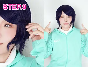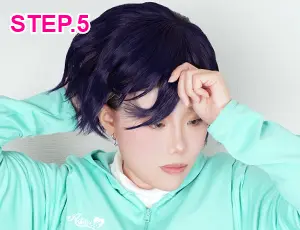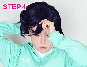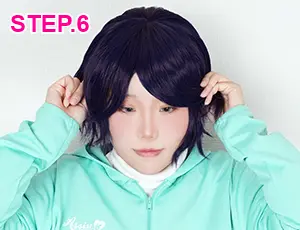 前髪や分け目を微調整し、ウィッグネットが見えないように少し前へ引き出して整えます。 -